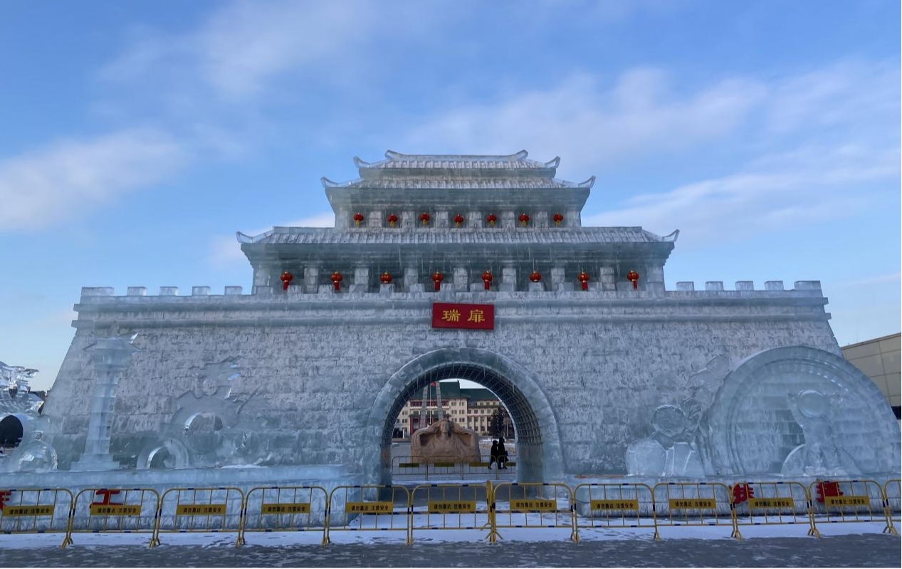 真冰雕刻而成的《盛世中華》冰雪景觀城樓矗立在文化廣場