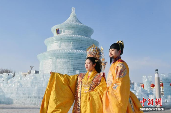 漢服愛(ài)好者打卡長(zhǎng)春冰雕“祈年殿”