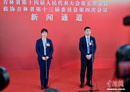 1月26日,在政協(xié)吉林省第十三屆委員會第四次會議委員通道上,侯佳貝(右一)回答記者提問。張瑤 攝