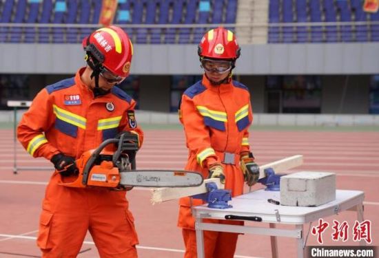 消防指戰(zhàn)員在進(jìn)行機(jī)動(dòng)鏈鋸的操作!埇 攝