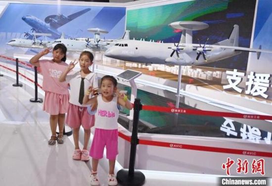 小朋友在與飛機(jī)模型拍照留念。張瑤 攝
