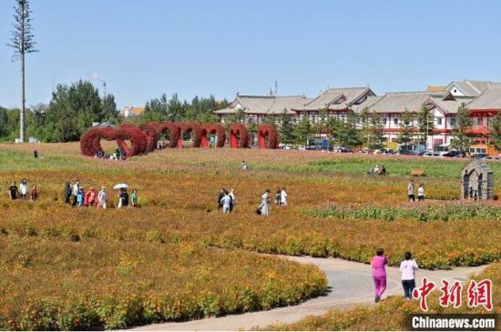 9月12日,在長春北湖花海,姹紫嫣紅的花朵在綠樹藍天的映襯下構(gòu)成了一幅美麗的秋色畫卷,吸引眾多游客前來觀賞。