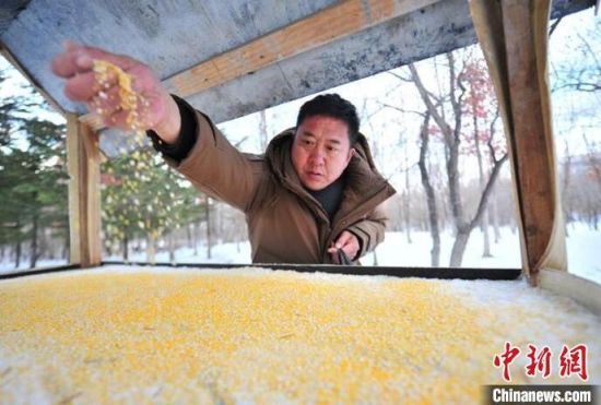 工作人員在投放鳥(niǎo)糧。