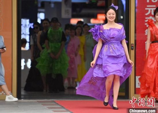 6月5日,吉林長(zhǎng)春,模特身穿綠色環(huán)保時(shí)裝走秀。值此世界環(huán)境日來(lái)臨之際,長(zhǎng)春開(kāi)展“塑制霓裳·環(huán)保領(lǐng)航”綠色環(huán)保時(shí)裝秀表演活動(dòng)。民眾將廢舊的報(bào)紙、塑料袋等廢舊物品變成了美麗的衣裳,宣傳環(huán)保意識(shí)。張瑤 攝