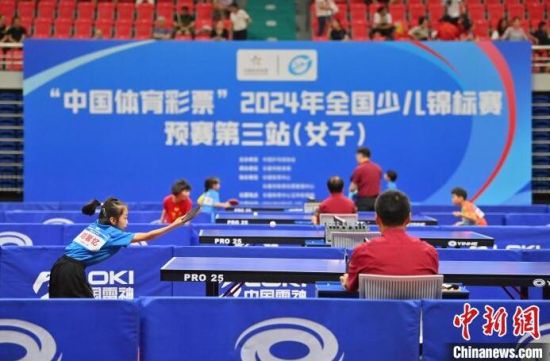 8月6日,吉林長春,選手在比賽。當(dāng)天,2024年全國少兒乒乓球錦標(biāo)賽預(yù)賽第三站(女子)在長春開賽,來自全國47個代表隊的少兒乒乓球運(yùn)動員同場比拼球技。(中新社記者 張瑤 攝)