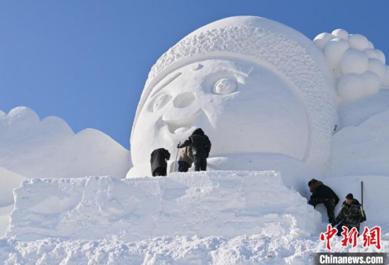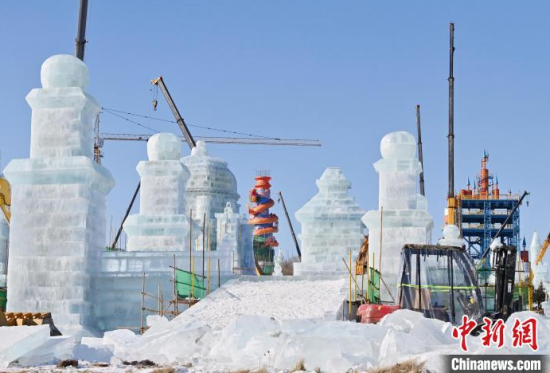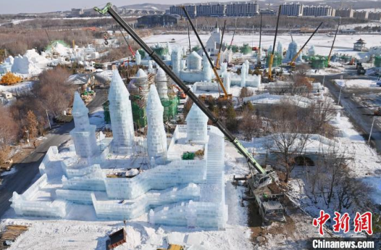 12月11日,吉林長春,工作人員正在長春冰雪新天地緊張施工。今年長春冰雪新天地總占地面積達到156萬平方米,冰雪雕塑200組創(chuàng)歷屆之最,并設置1314米的空中雪漂流、520米的冰滑梯等設施供中外游客游玩。中新社記者 張瑤 攝