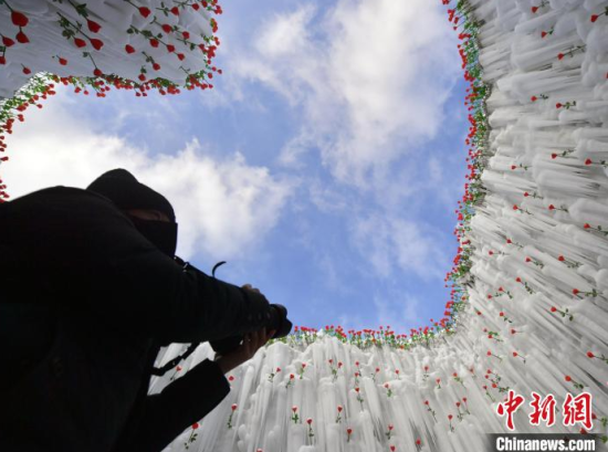 12月26日,吉林長白山,游客在冰洞內(nèi)打卡。進入雪季,長白山推出“愛心冰封玫瑰”吸引大量游客打卡拍照,冰洞內(nèi)被玫瑰道具環(huán)繞,洞頂呈心形,充滿浪漫氣息。