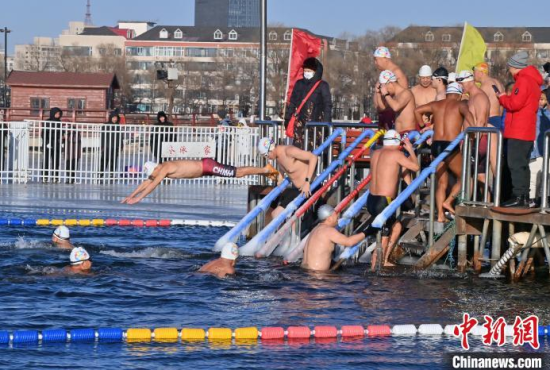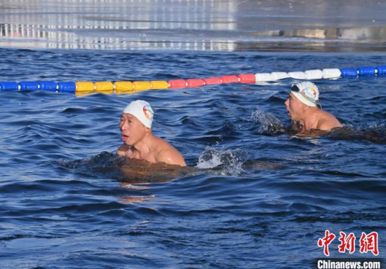 2025年1月1日,在長春南湖公園,冬泳愛好者破冰在湖水中暢游。當(dāng)天,中外百余名冬泳愛好者齊聚南湖,以冬泳的方式迎接新年。中新社記者 張瑤 攝