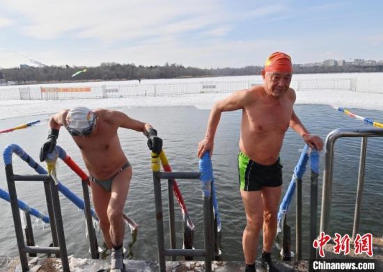 2月19日,在長春南湖公園,吳長海(右)準備和泳友一起冬泳。今年85歲的吳長海堅持冬泳已有三十余年,冬泳已成為他每天生活中必不可少的一件事。當天長春氣溫達零下17攝氏度,吳長海說,冬泳使他身體強壯,以后會堅持下去。中新社記者 張瑤 攝