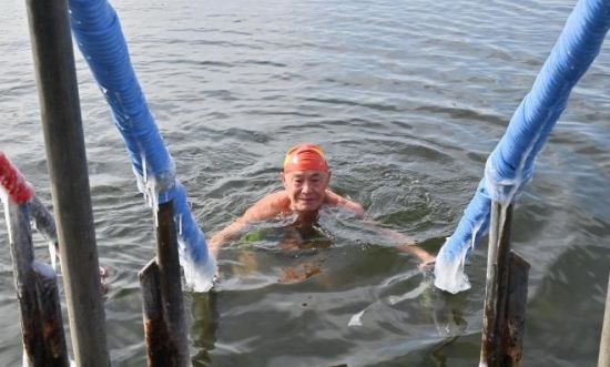 2月19日,在長春南湖公園,吳長海在冬泳。中新社記者 張瑤 攝