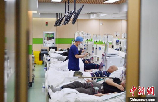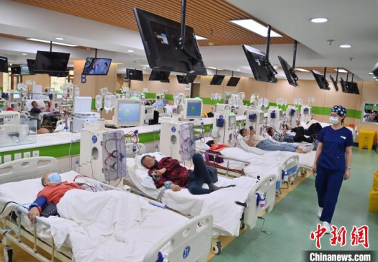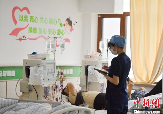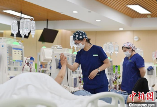 5月9日,長(zhǎng)春中醫(yī)藥大學(xué)附屬醫(yī)院腎病科透析室內(nèi),護(hù)士在為患者進(jìn)行透析治療。該科室日均接診近200名患者,每位患者的透析過程都需要數(shù)小時(shí)。治療期間,護(hù)士們會(huì)全程密切監(jiān)測(cè)患者生命體征,隨時(shí)準(zhǔn)備應(yīng)對(duì)突發(fā)狀況。多年來(lái),醫(yī)護(hù)團(tuán)隊(duì)以專業(yè)的技能和細(xì)致的關(guān)懷,持續(xù)為患者的生命健康保駕護(hù)航。中新社記者 張瑤 攝