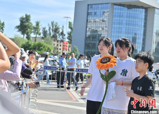 6月7日,吉林省長春市,在吉林省實驗中學(xué)考點,陪考人員為考生加油。當(dāng)日,2025年全國高考拉開帷幕。中新社記者 張瑤 攝