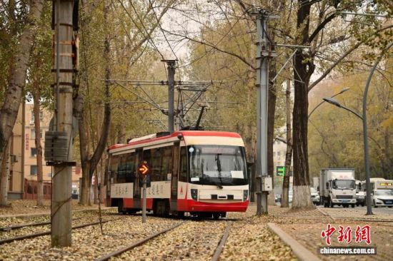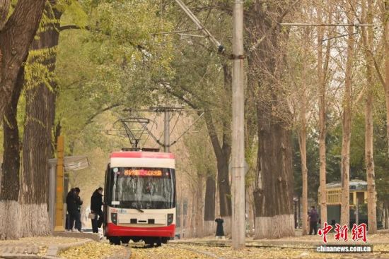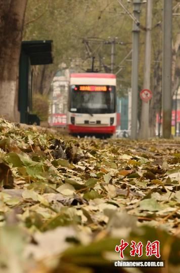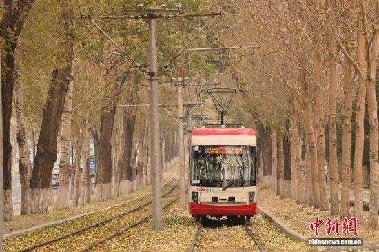 11月5日,吉林長(zhǎng)春秋意正濃,一處軌道兩旁的樹葉泛黃,有軌電車宛如在畫中穿行。中新社記者 張瑤 攝