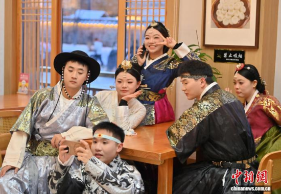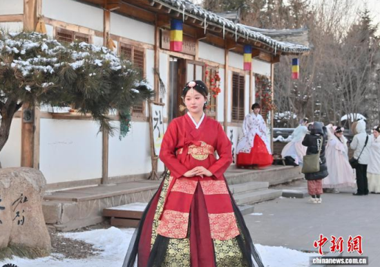 12月2日,在吉林省延邊州延吉市中國(guó)朝鮮族民俗園內(nèi),游客身著朝鮮族服飾拍照。作為中國(guó)唯一的朝鮮族自治州和最大朝鮮族聚居地,延邊近年旅游熱度持續(xù)攀升,朝鮮族服飾旅拍已成為當(dāng)?shù)刈钍軞g迎的旅游體驗(yàn)之一。盡管遭遇降溫降雪天氣,游客熱情依然不減,在銀裝素裹的園中定格獨(dú)具民族風(fēng)情的畫(huà)面。中新社記者 張瑤 攝