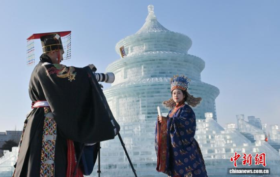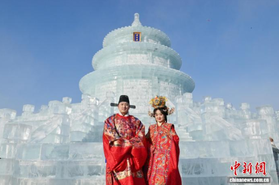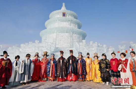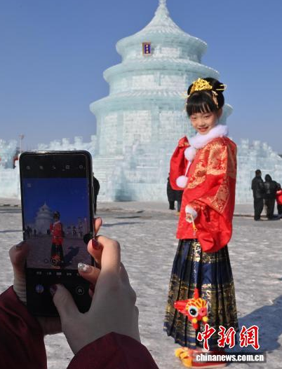 1月24日,長(zhǎng)春市文化廣場(chǎng)上,眾多漢服愛好者齊聚巨型冰雕“祈年殿”前拍照留念。該冰雕以北京天壇為原型,通體晶瑩,飛檐斗拱皆現(xiàn)冰雪之韻。衣袂飄飄的漢服身影與剔透冰雕相映成趣。中新社記者 張瑤 攝